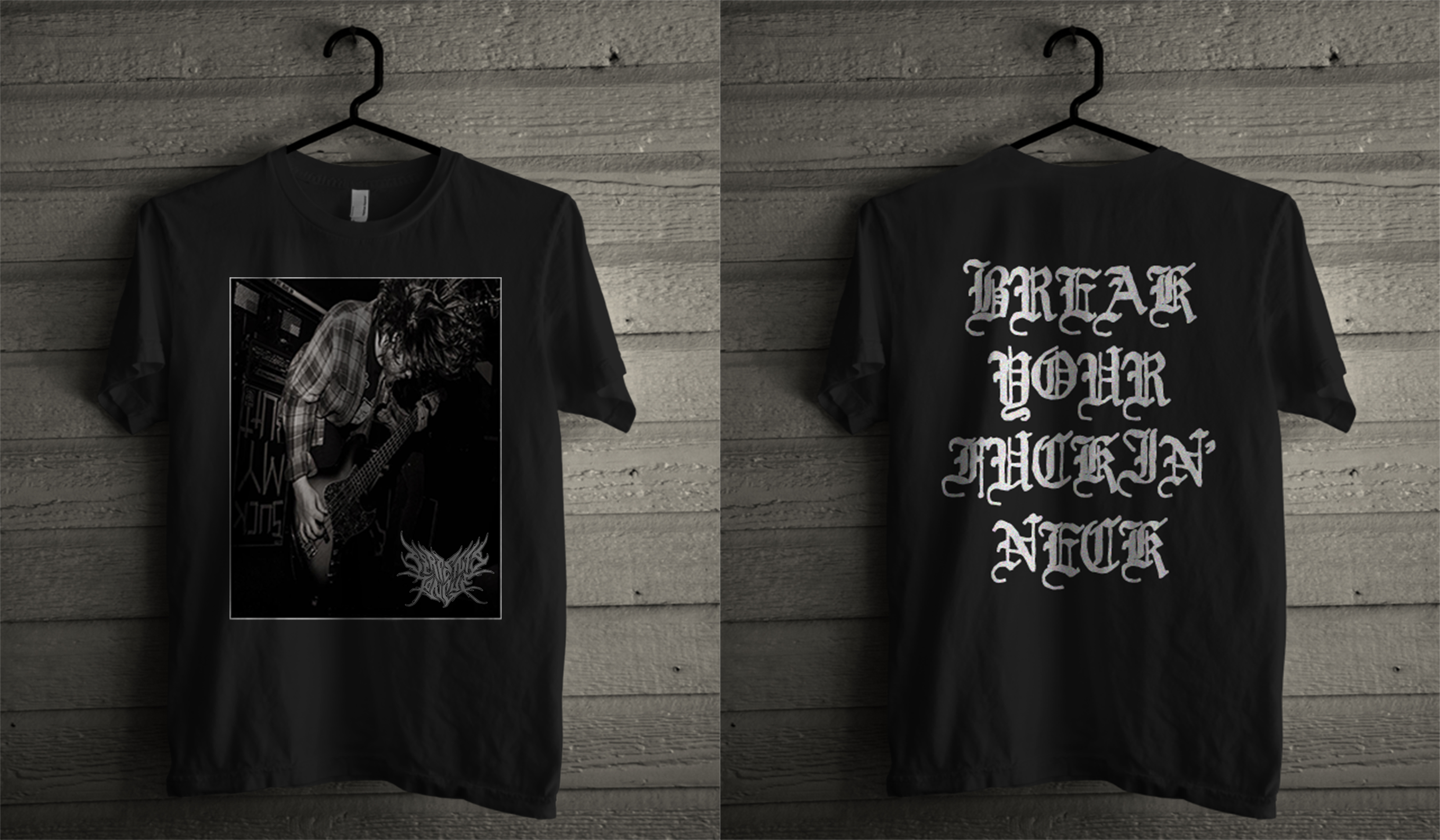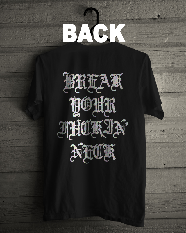 Printed on Alstyle tees, best god damn tees on this stupid earth. Live shot in front, "Break Your Fuckin' Neck" big on back! Do eeeet